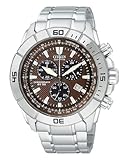 You Save : 40% Citizen Men's AT0810-55X Eco-Drive Stainless Steel Sport Watch The Citizen Men's Eco-Drive Stainless Steel Sport Watch has been perfected to suit both the professional man and the outdoorsman. This solar-powered Eco-Drive watch never needs a battery and remains charged for months at a time, even in the dark. Distinguished by handsome brown tones and chronograph technology, this watch's circular dial features three black subdials with sweeping hands over a chocolate-brown background. Textured with a grooved pattern, this background catches the light along with its overlaid frame of luminescent silver-tone bar hour markers and easy-to-read stick second markers. A large date window is perched at the four o'clock for at-a-glance reference, while the outermost dial is constructed with a tachymeter rim for computing speed (based on travel time) and distance (based on speed). This impressive dial is held by a silver-tone stainless steel case and bezel. And if you like to time short events, you'll be glad to note that the bezel is etched with Arabic second indexes in intervals of fifteen, as well as notched second markers along the first quarter-hour. A fine stainless steel band fastens this watch, offering quick, one-hand fastening, thanks to its fold-over-clasp-with-safety. Boasting a durable mineral window and the reliability of Japanese-quartz movement, this smart, distinctive timepiece is water resistant to 330 feet (100 M).